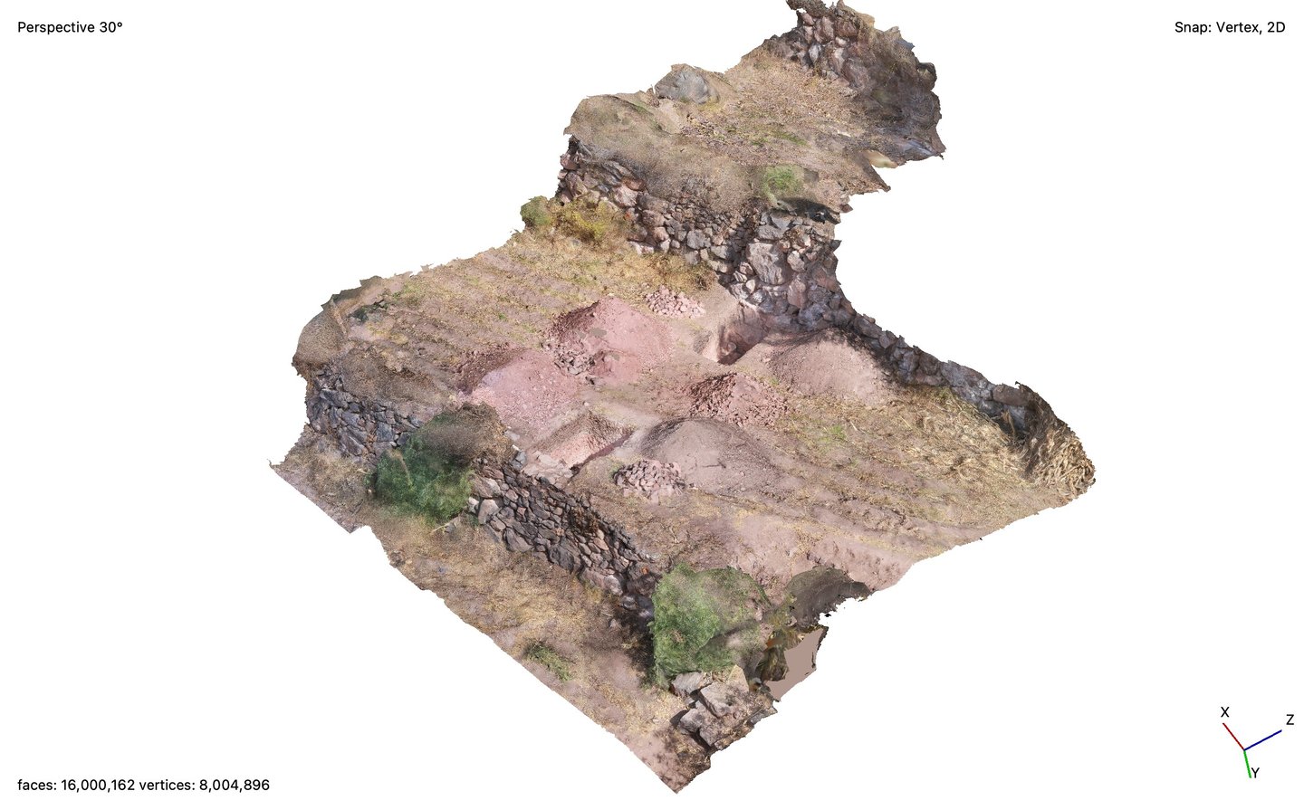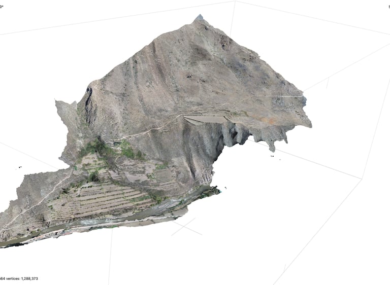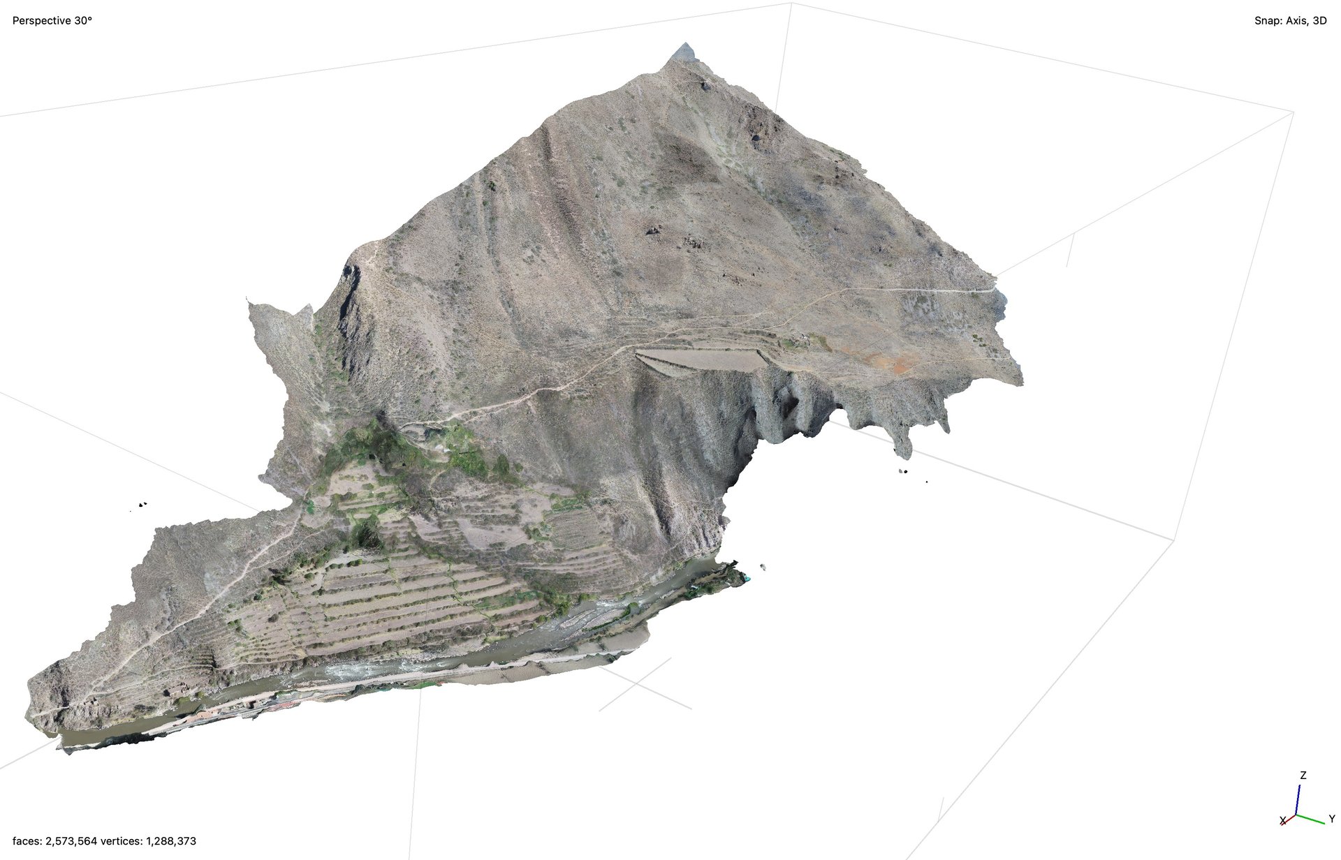 This research relies heavily on UAV photography, photogrammetry, and GIS to model terrace complexes. These models allow us to document factors ranging from the stratigraphy of specific terraces to valley-wide hydrology. From top left: Domestic excavations documented using UAV images; a single excavated terrace, modeled using photogrammetry; the terrace complex of Simapuqio modeled in full.