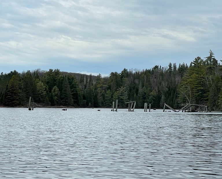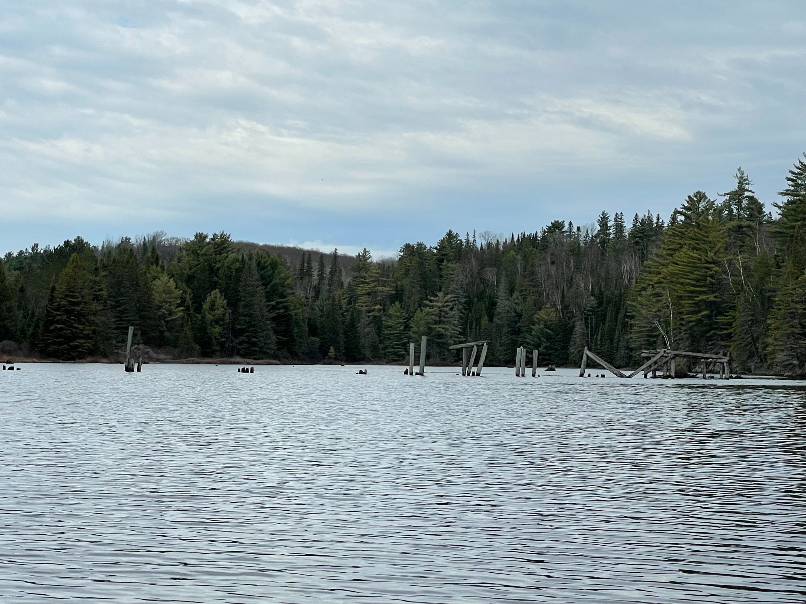 In Algonquin Park, archaeological survey by canoe documents remnants of 19th and 20th century logging, the remnants of historic recreation and conservation activities, and sites associated with the Indigenous peoples evicted from the Park at its founding. Above: the remains of a trestle by which logs were extracted from the park.