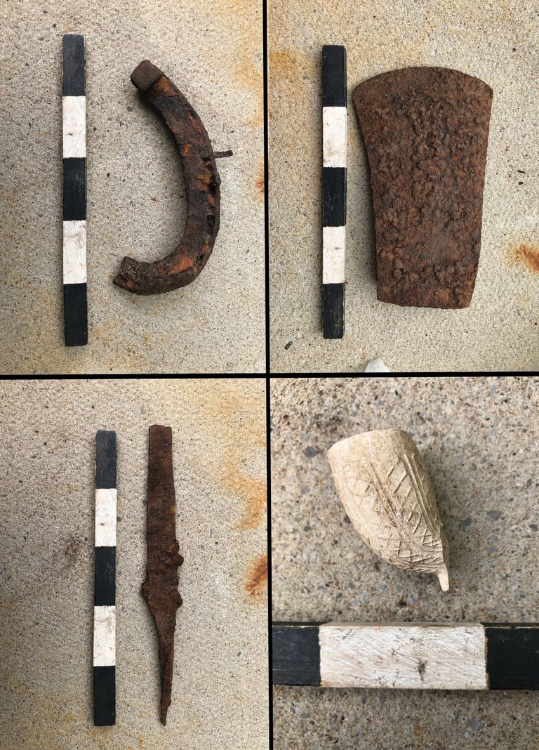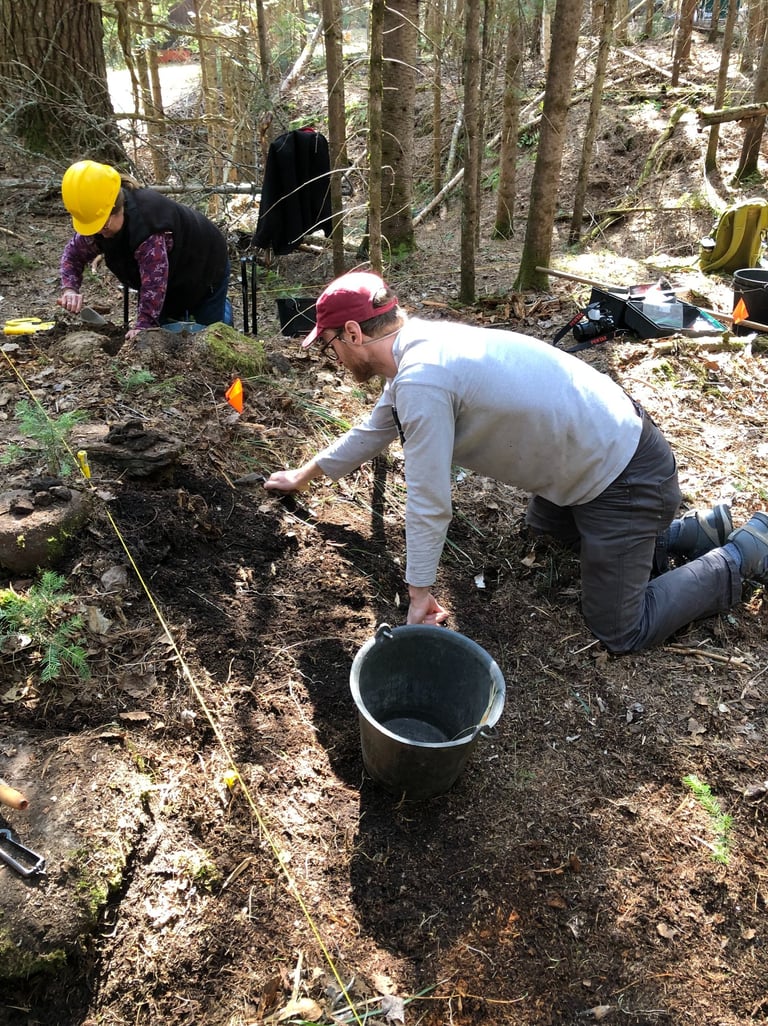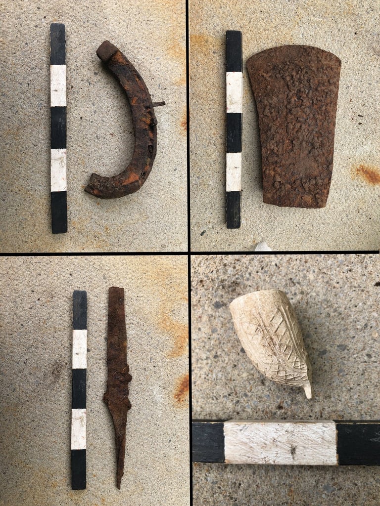 Excavation is also an important part of my work in the park. In 2023 I worked with local archaeologist Rory MacKay to excavate a 19th century 'camboose' style timber shanty. Photos: Excavation alongside volunteers; a pipestem recovered in excavations; other artifacts, including an axe head; a site plan of the shanty.